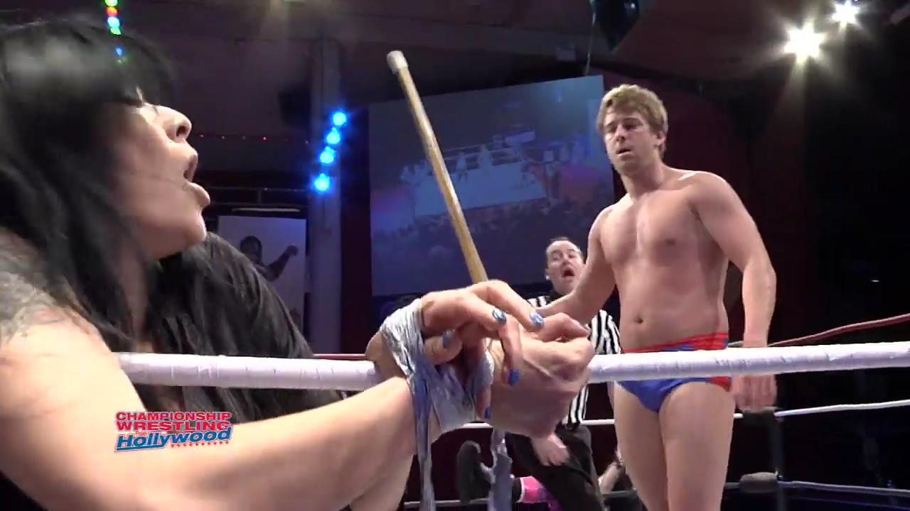 From an indy show that is available in its entirety on youtube (https://www.youtube.com/watch?v=kHWQNs0S12o). Shelly is up to heel valet antics once again and this time, she gets duck taped to the ropes for the remainder of the match. After her man's opponent wins, he decides to spank Shelly with a kendo stick.