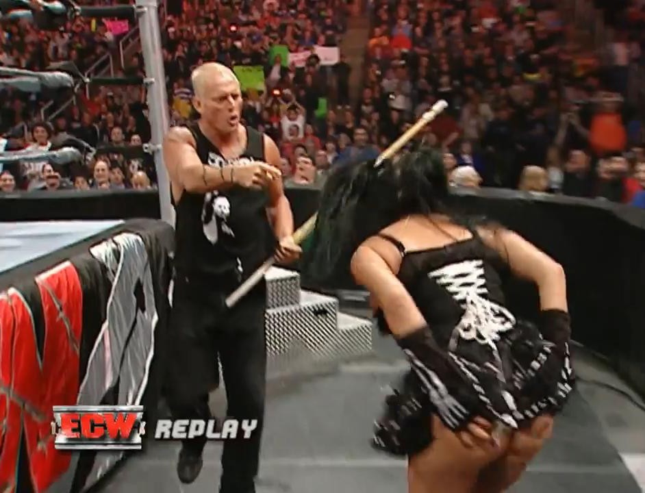 Martinez as Ariel in WWE's ill-fated ECW reboot, would try to interfere in a tag team match and The Sandman gives her a little something to think about.
